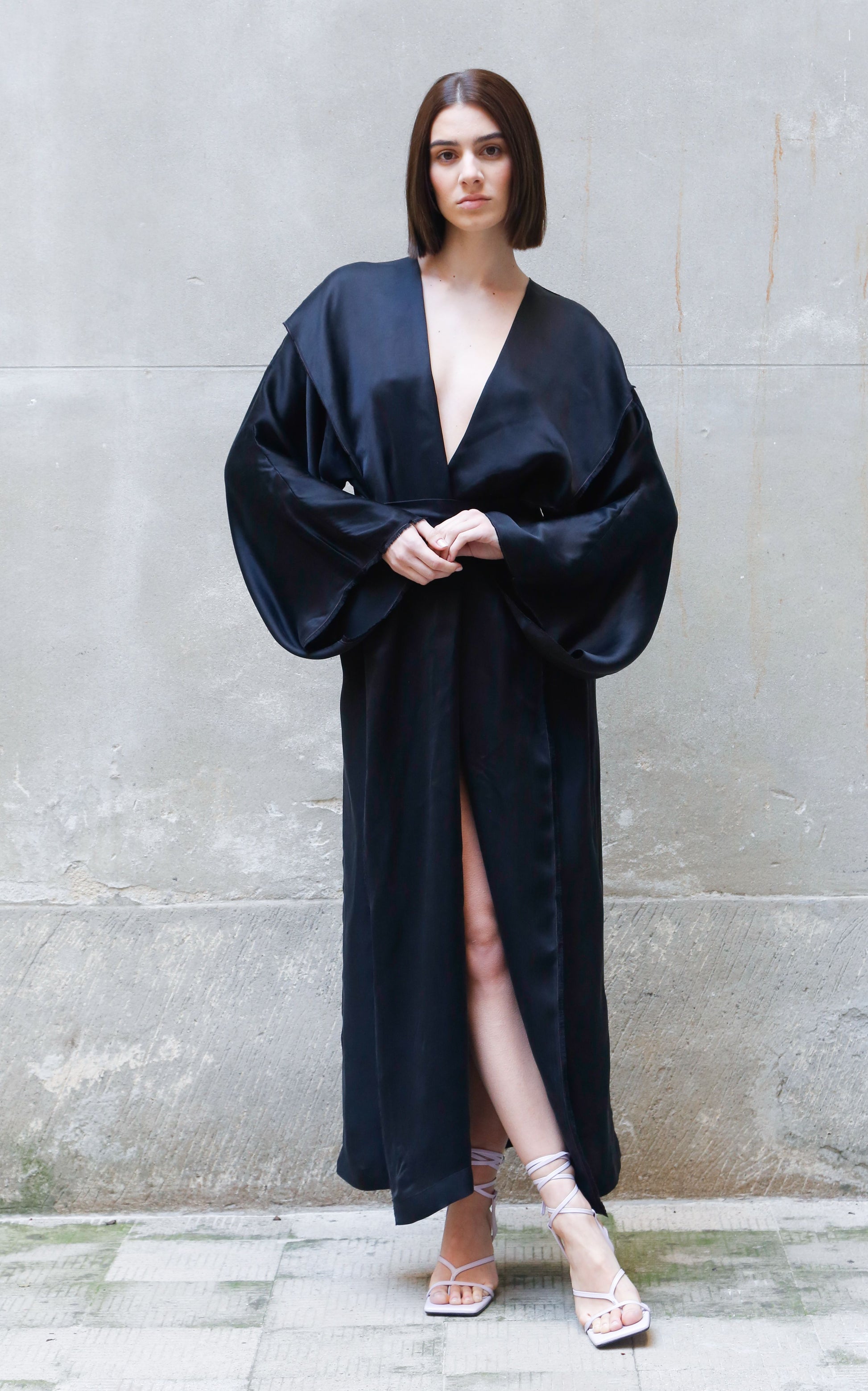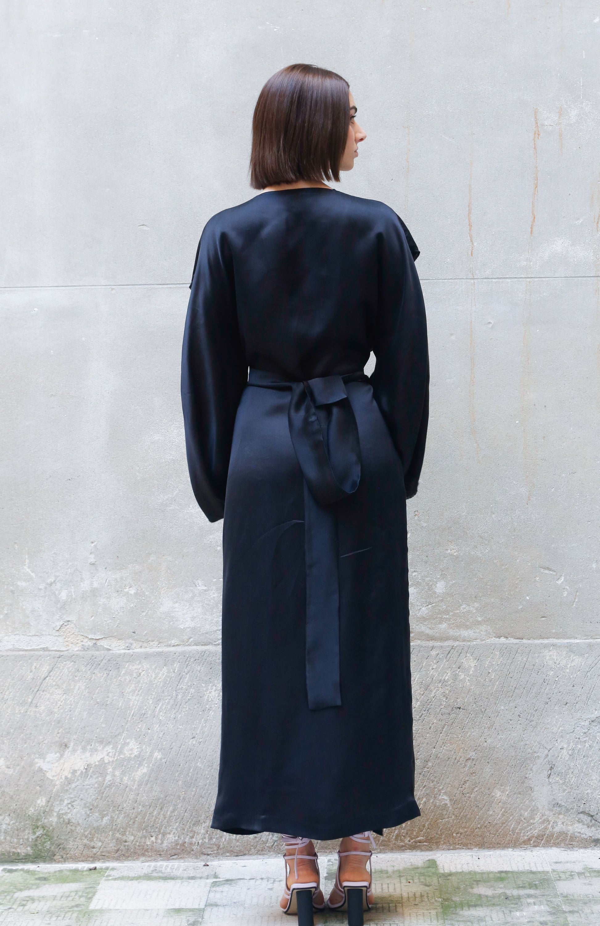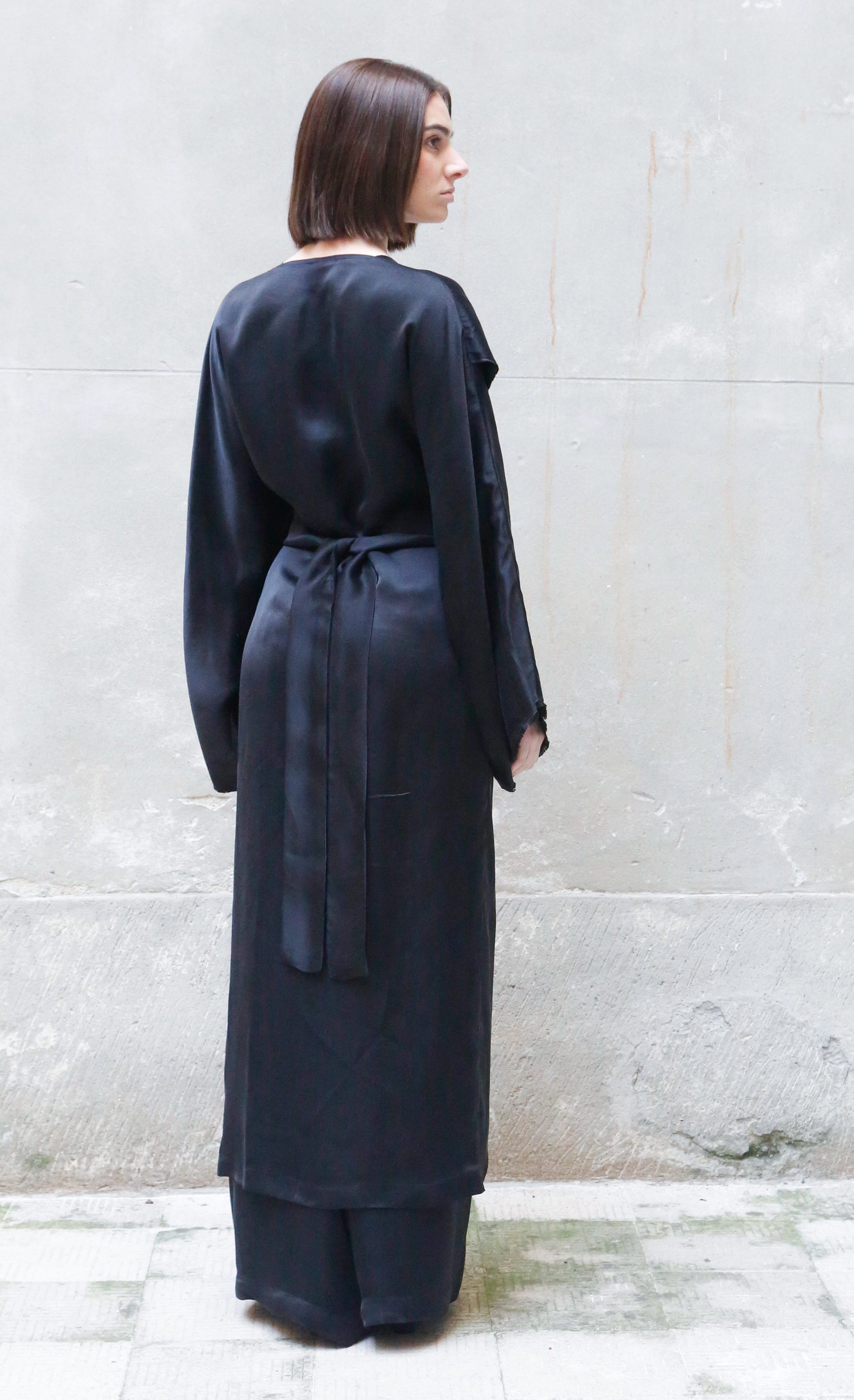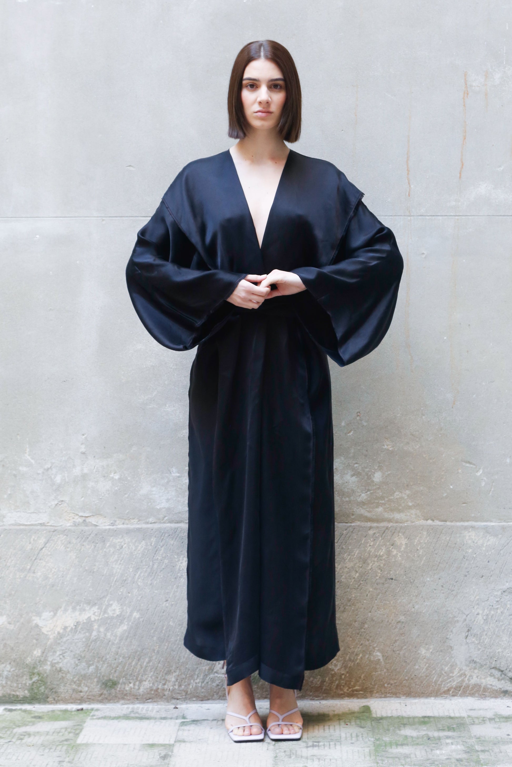 A kimono/wrap dress with wide sleeves, with special attention to the waist line highlighting it through soft and clean volume. Belt to tie, worn both loose and fastened, giving infinite versatility. Peach skin soft material.