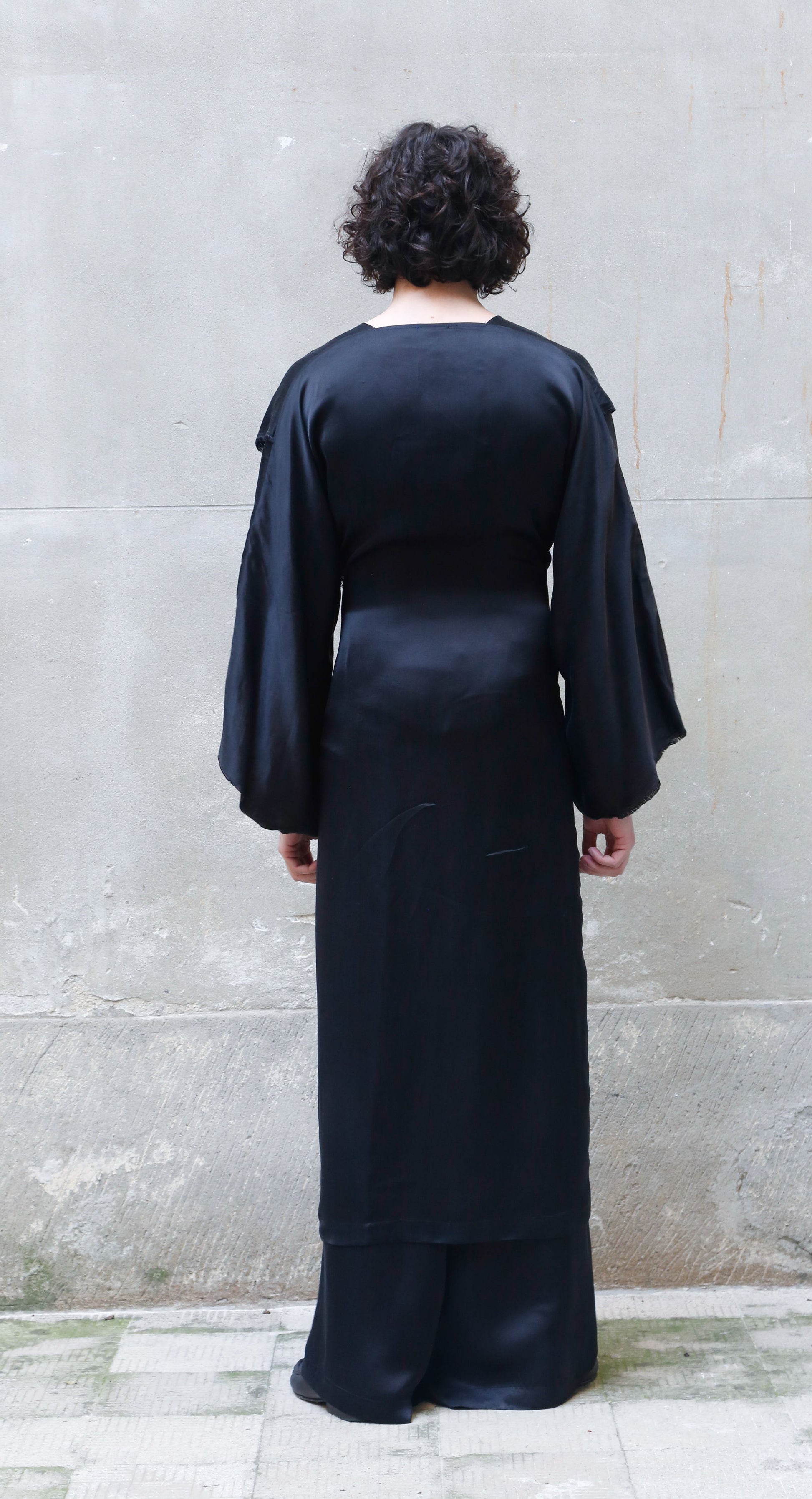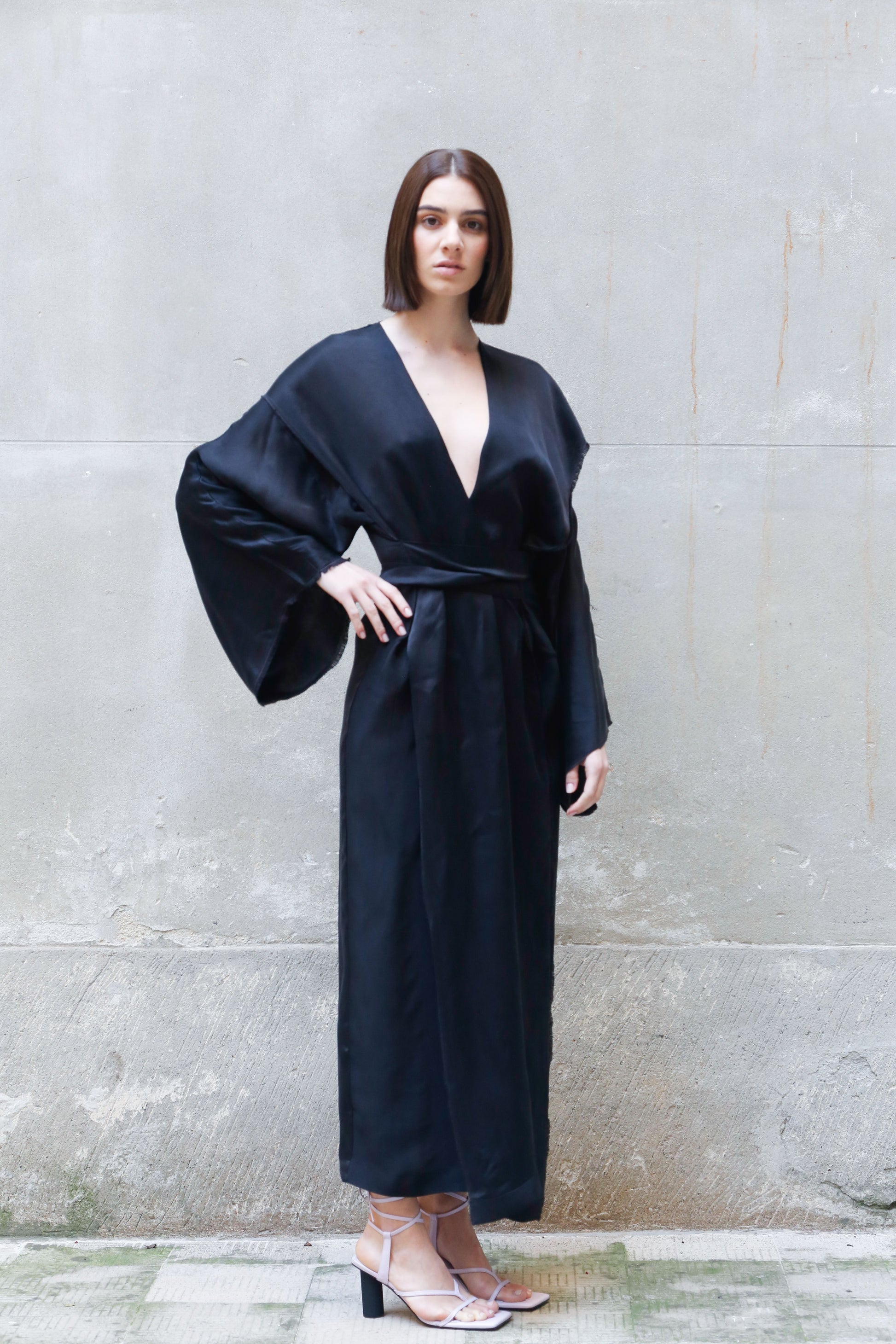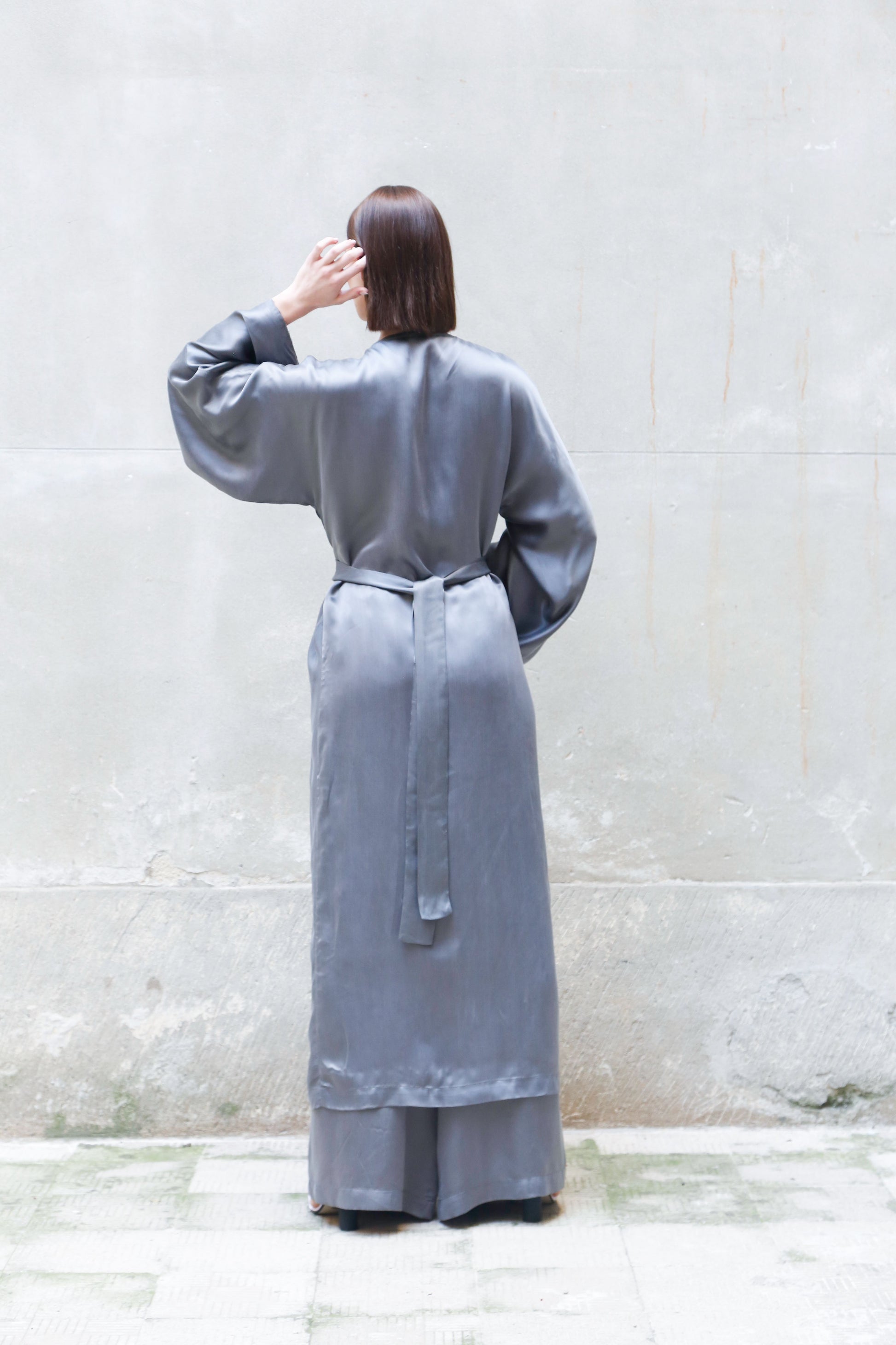 A kimono/wrap dress with wide sleeves, with special attention to the waist line highlighting it through soft and clean volume. Belt to tie, worn both loose and fastened, giving infinite versatility. Peach skin soft material.
