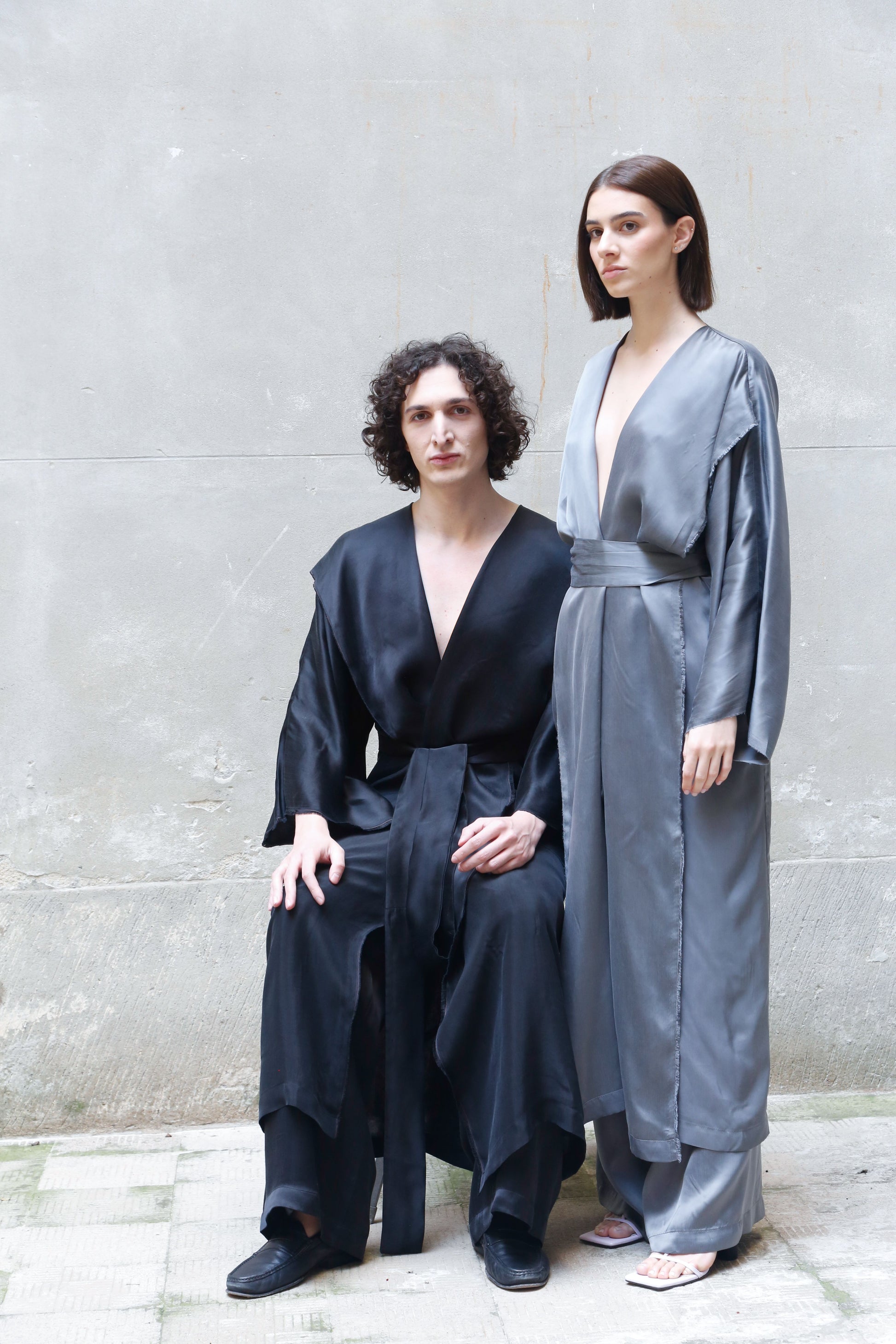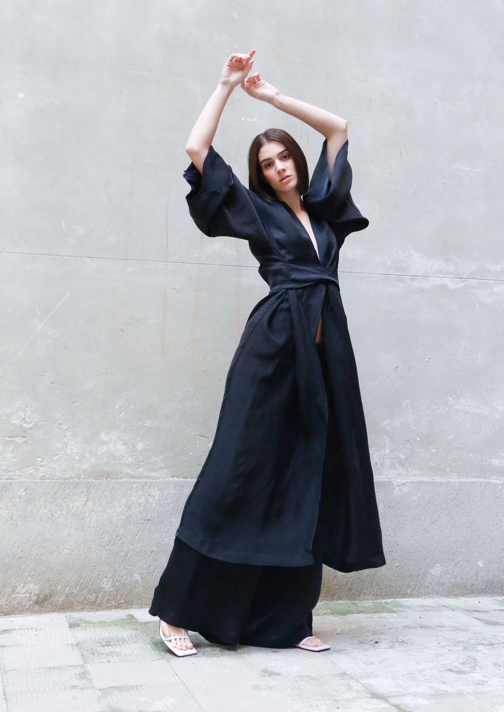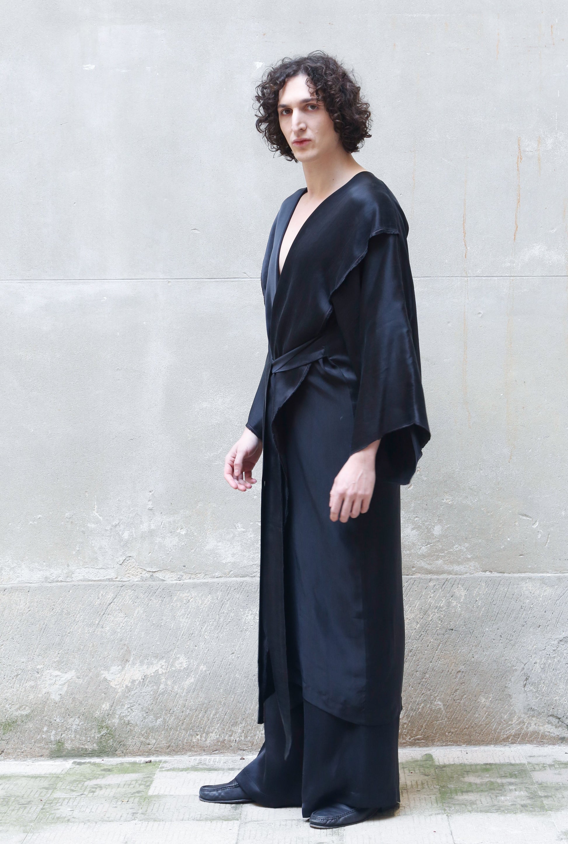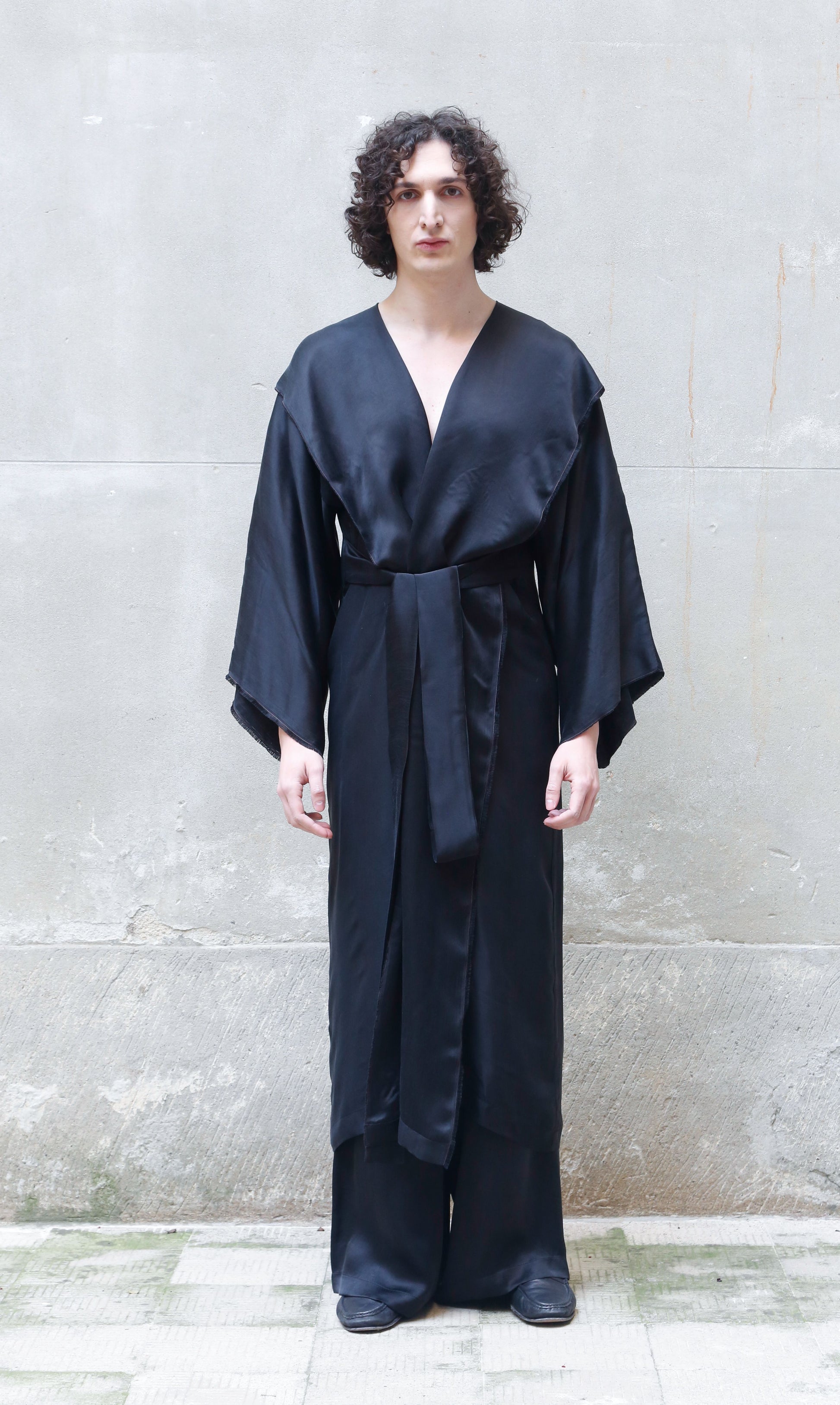 A kimono/wrap dress with wide sleeves, with special attention to the waist line highlighting it through soft and clean volume. Belt to tie, worn both loose and fastened, giving infinite versatility. Peach skin soft material.