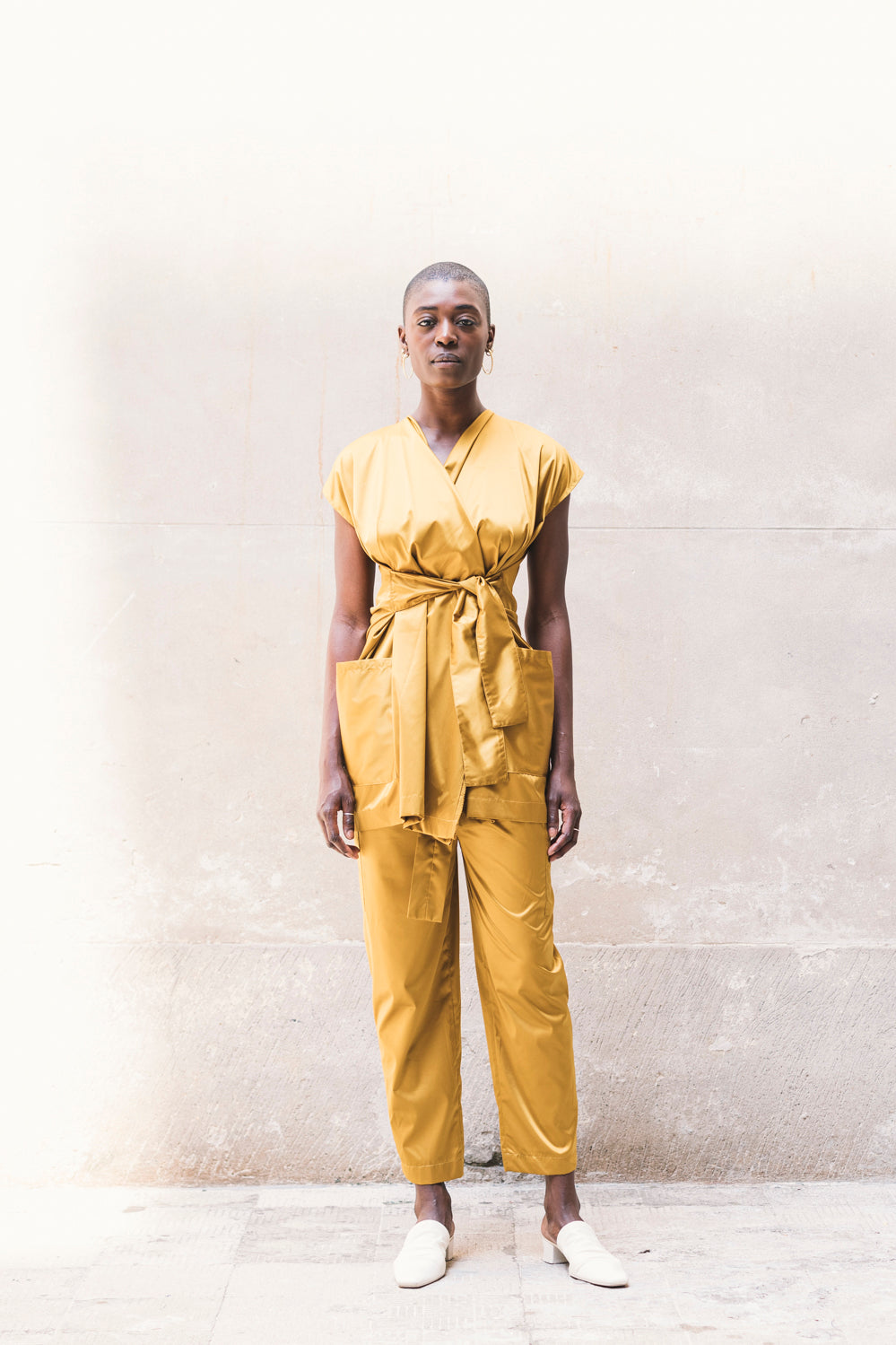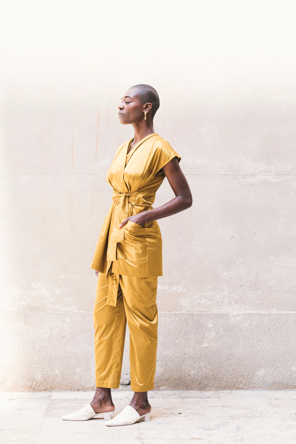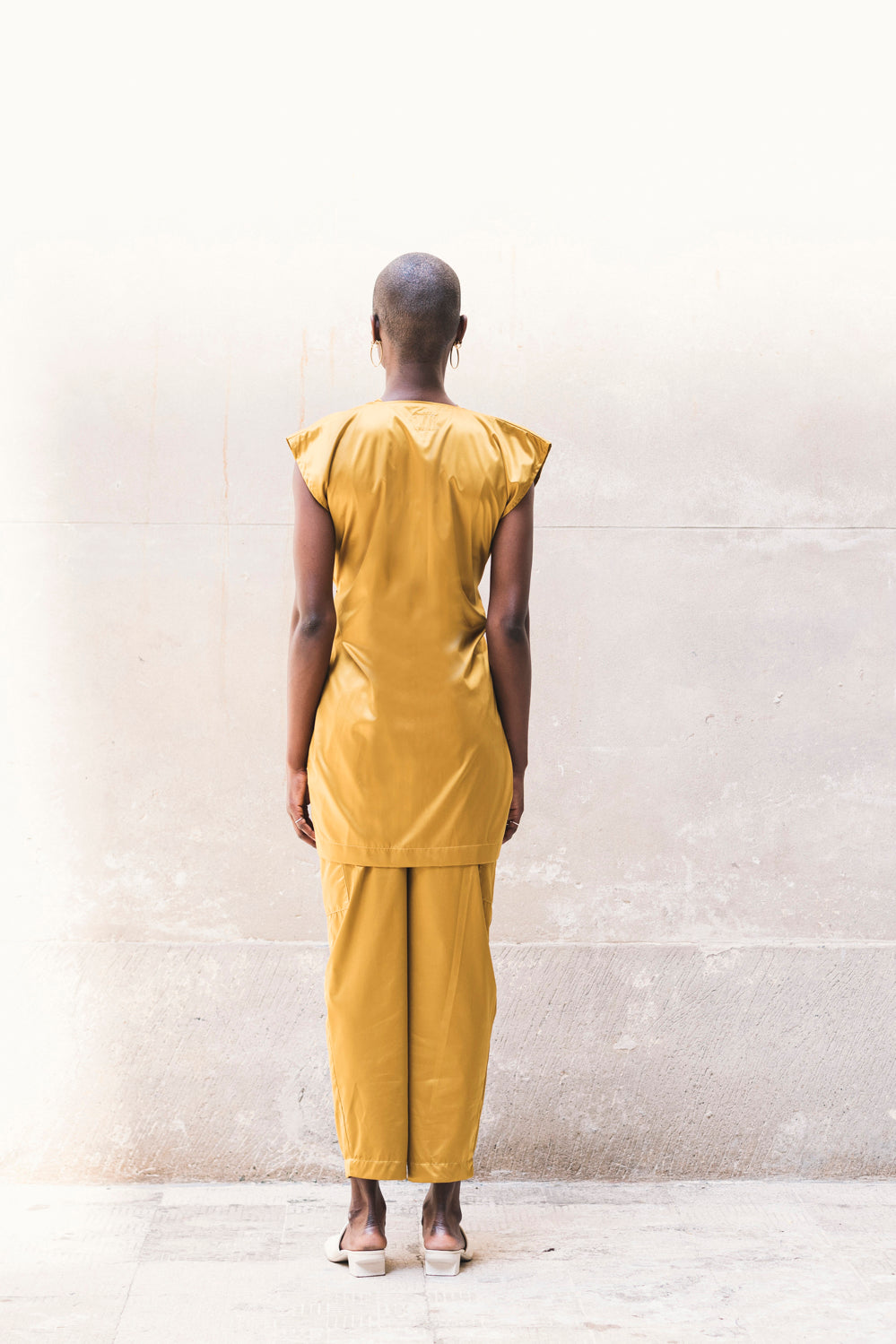 The pattern is developed based on a zero-waste technique that eliminates textile waste at the design stage, specialty of ZEROBARRACENTO.