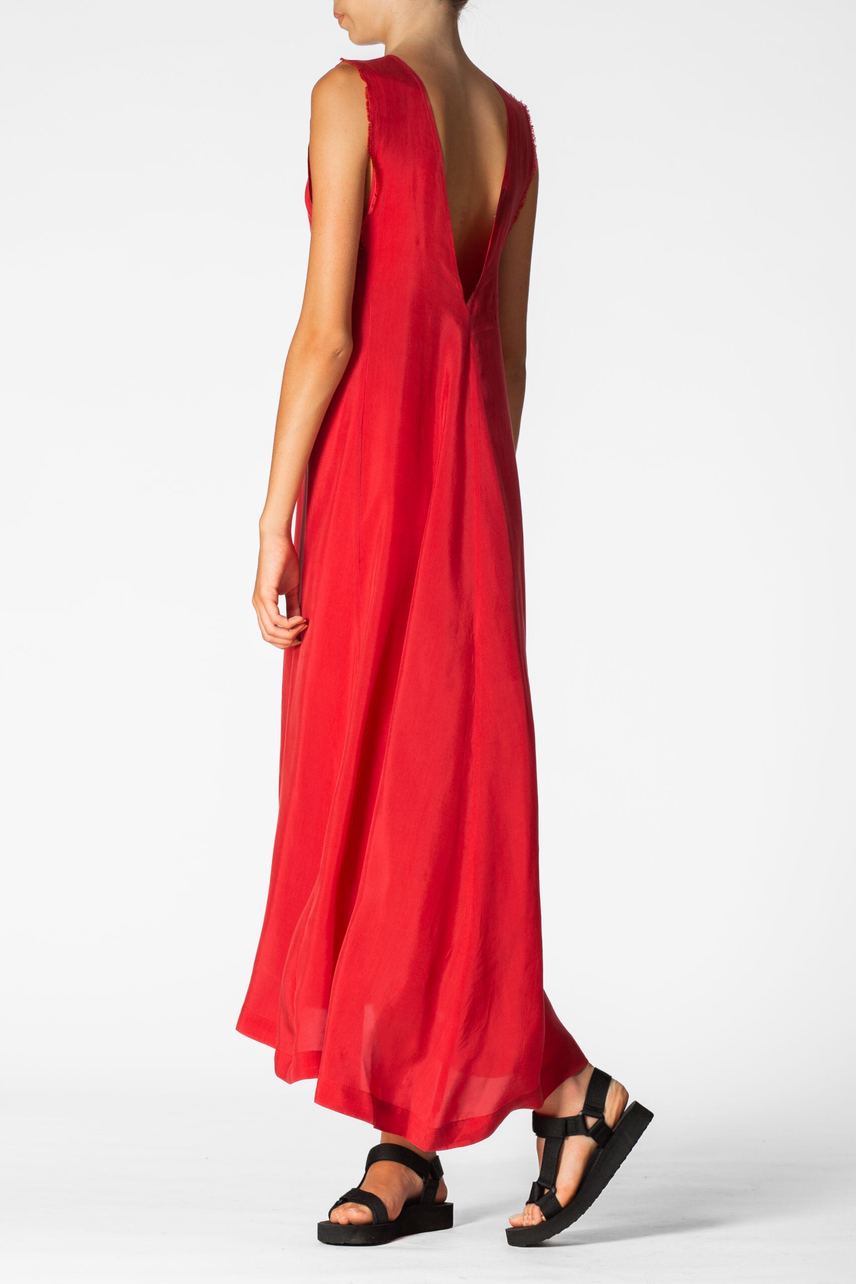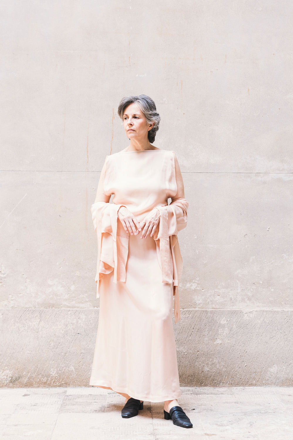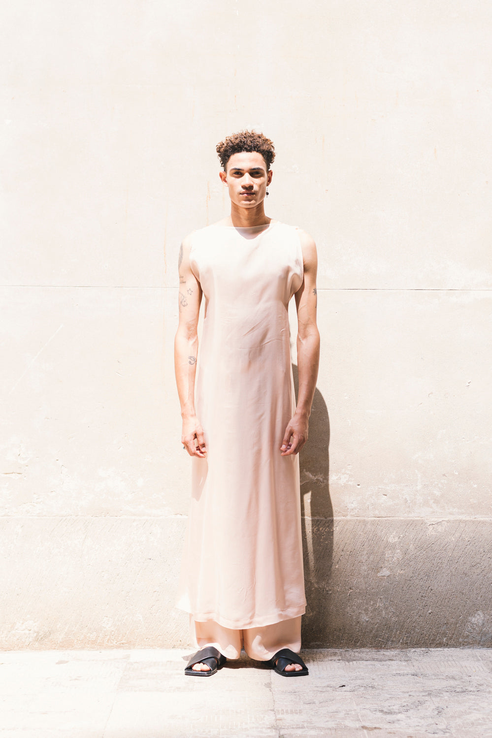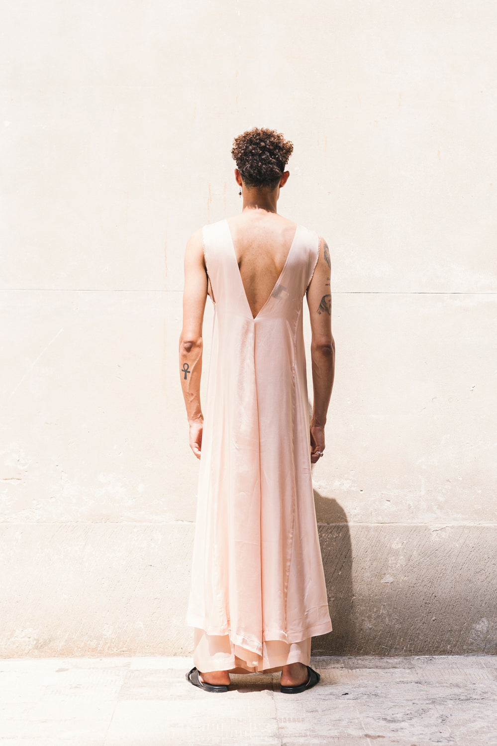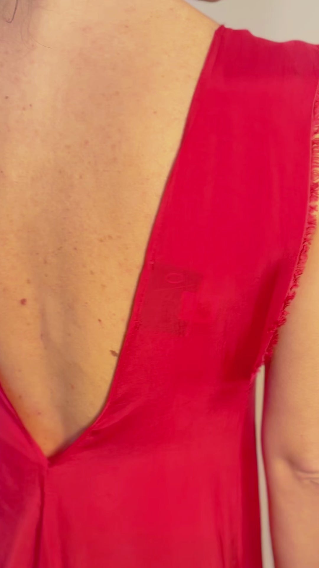 Deep geometric back neckline and boat neck. It can be worn alone or layered over long trousers or a maxi skirt for total versatility.