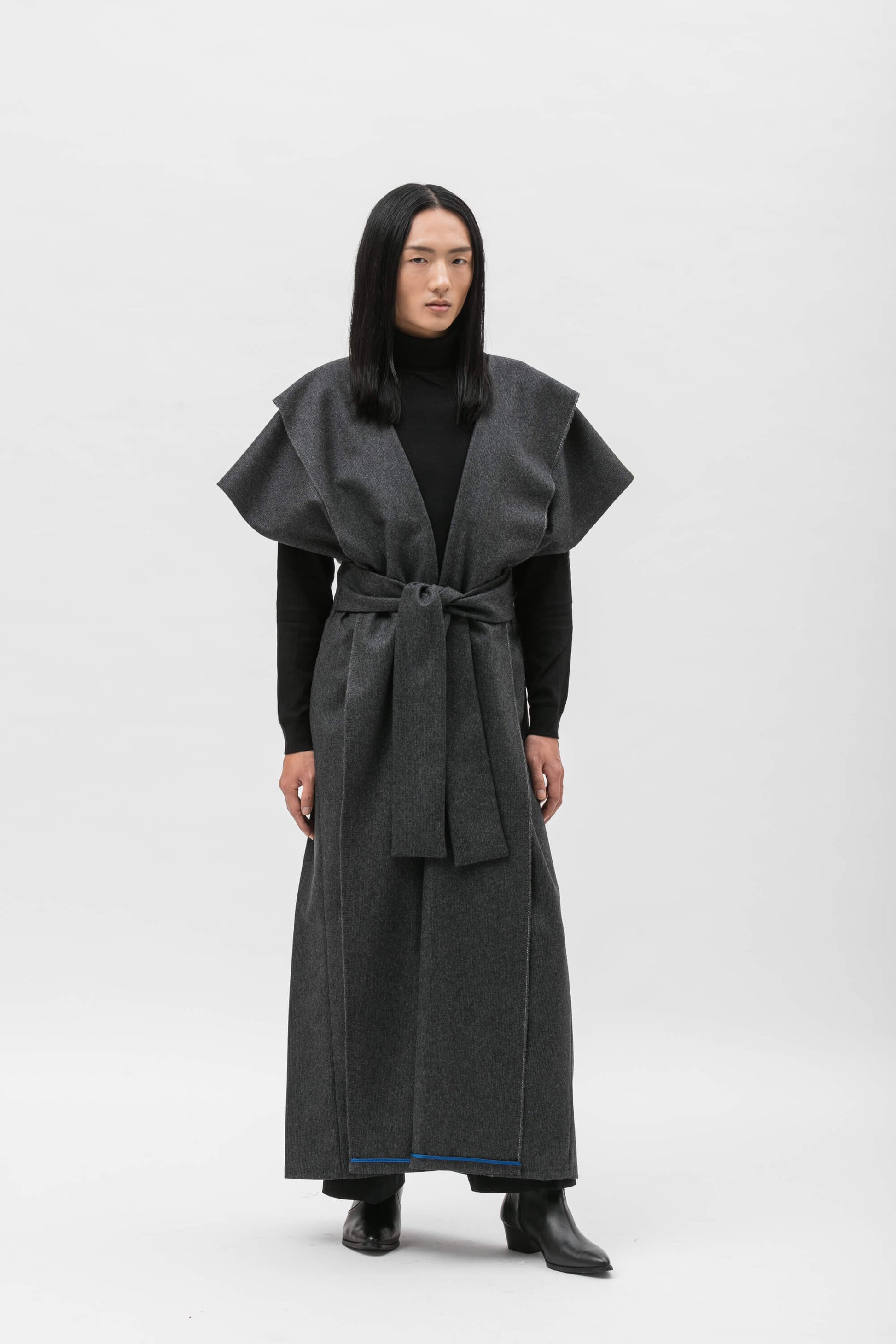 This extra long kimono in recycled grey is a gender-neutral piece. Made in Italy with high quality materials it's developed making use of the distinctive zero-waste technique, speciality of ZEROBARRACENTO.
