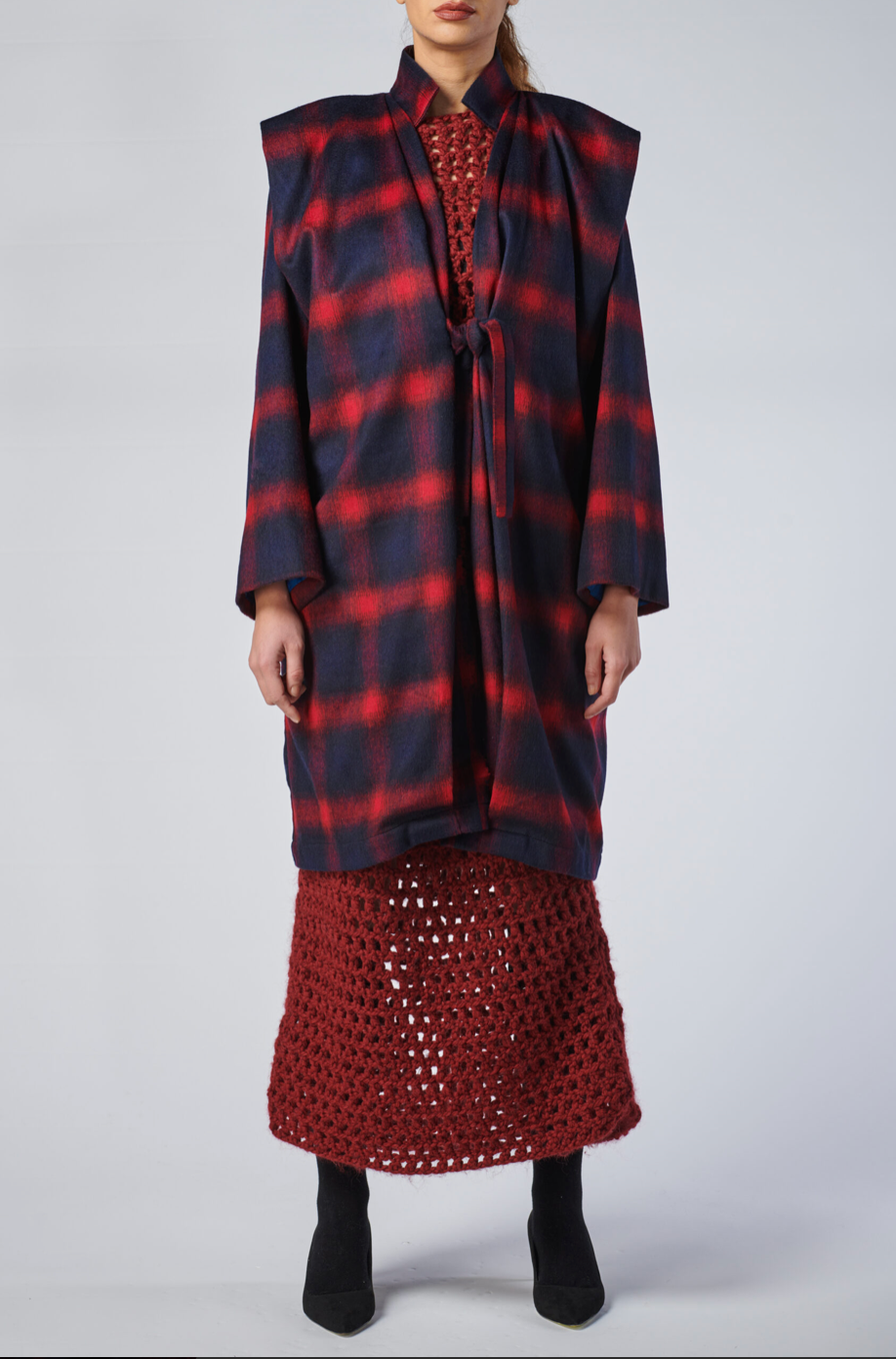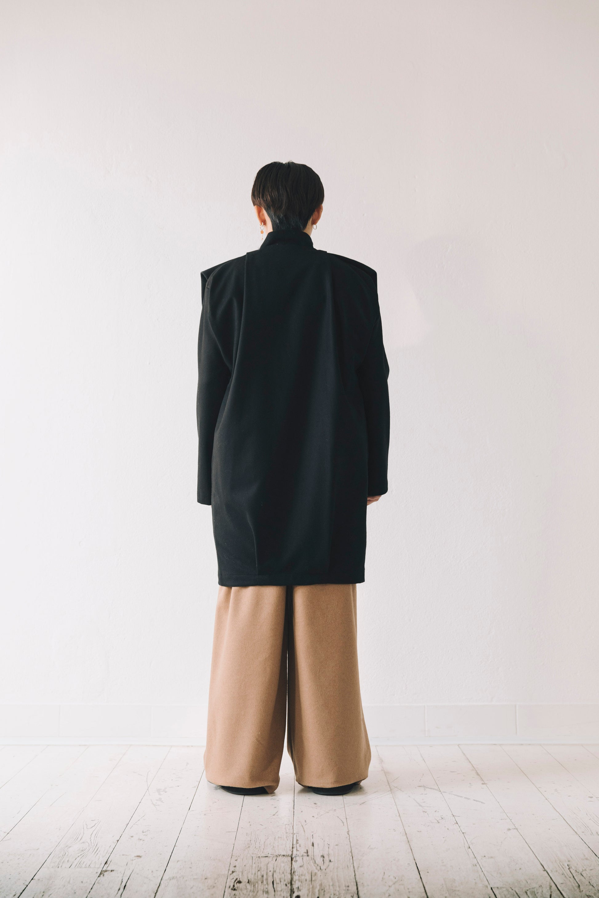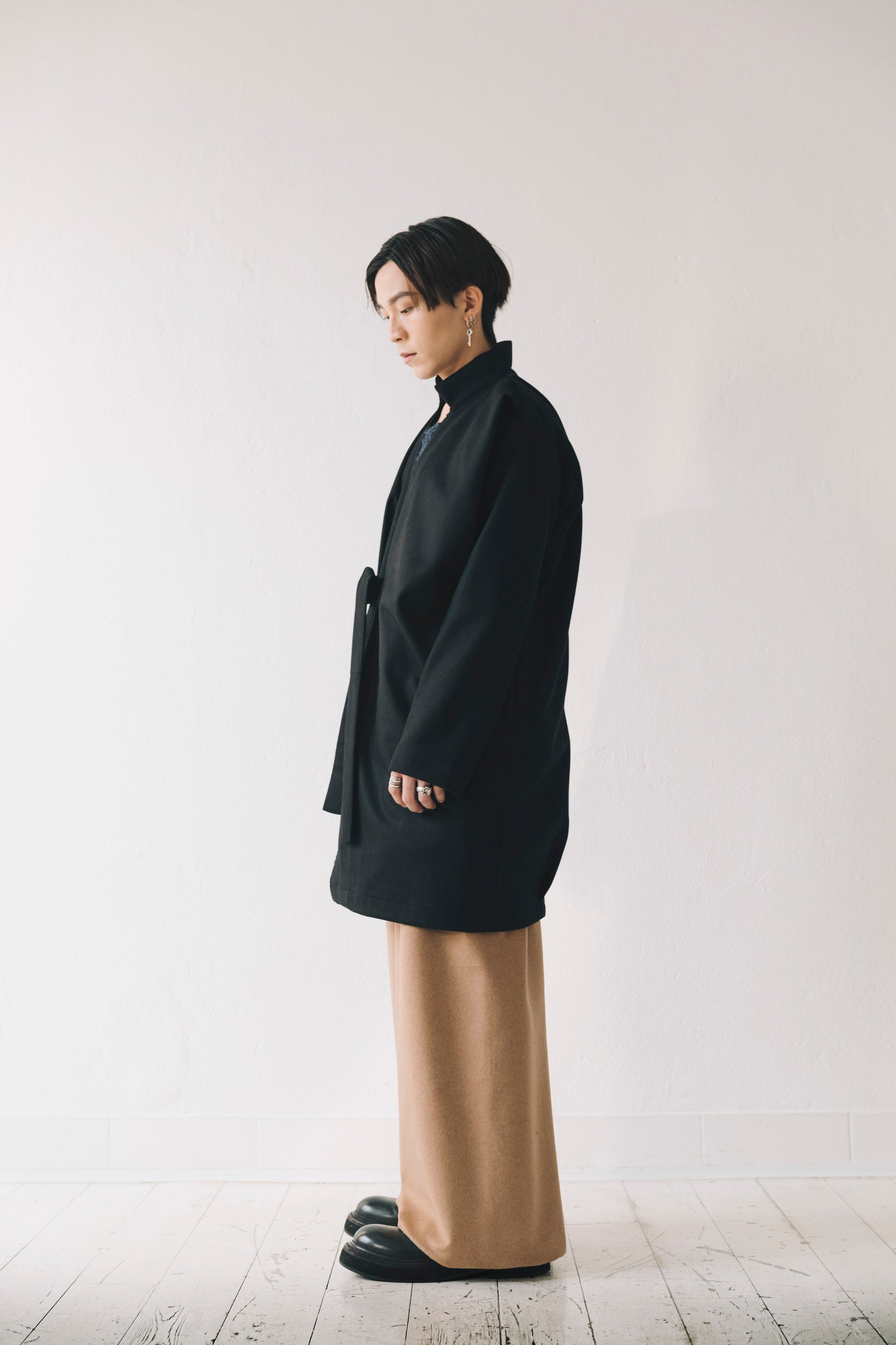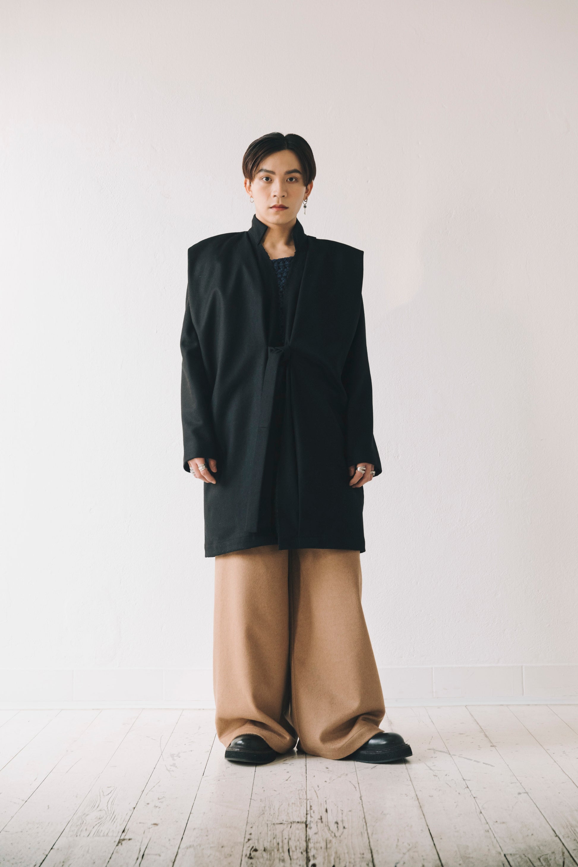 MICHIYUKI is a traditional Japanese jacket or overcoat closed in front and it has a square collar, with sleeves similar to those found in the Kimonoo. Traditionally it was used by women over the Kimonoo itself to protect themselves from the cold. Our proposal has a semi-rigid Korean collar as well as a wide volume on the front and side pockets.
