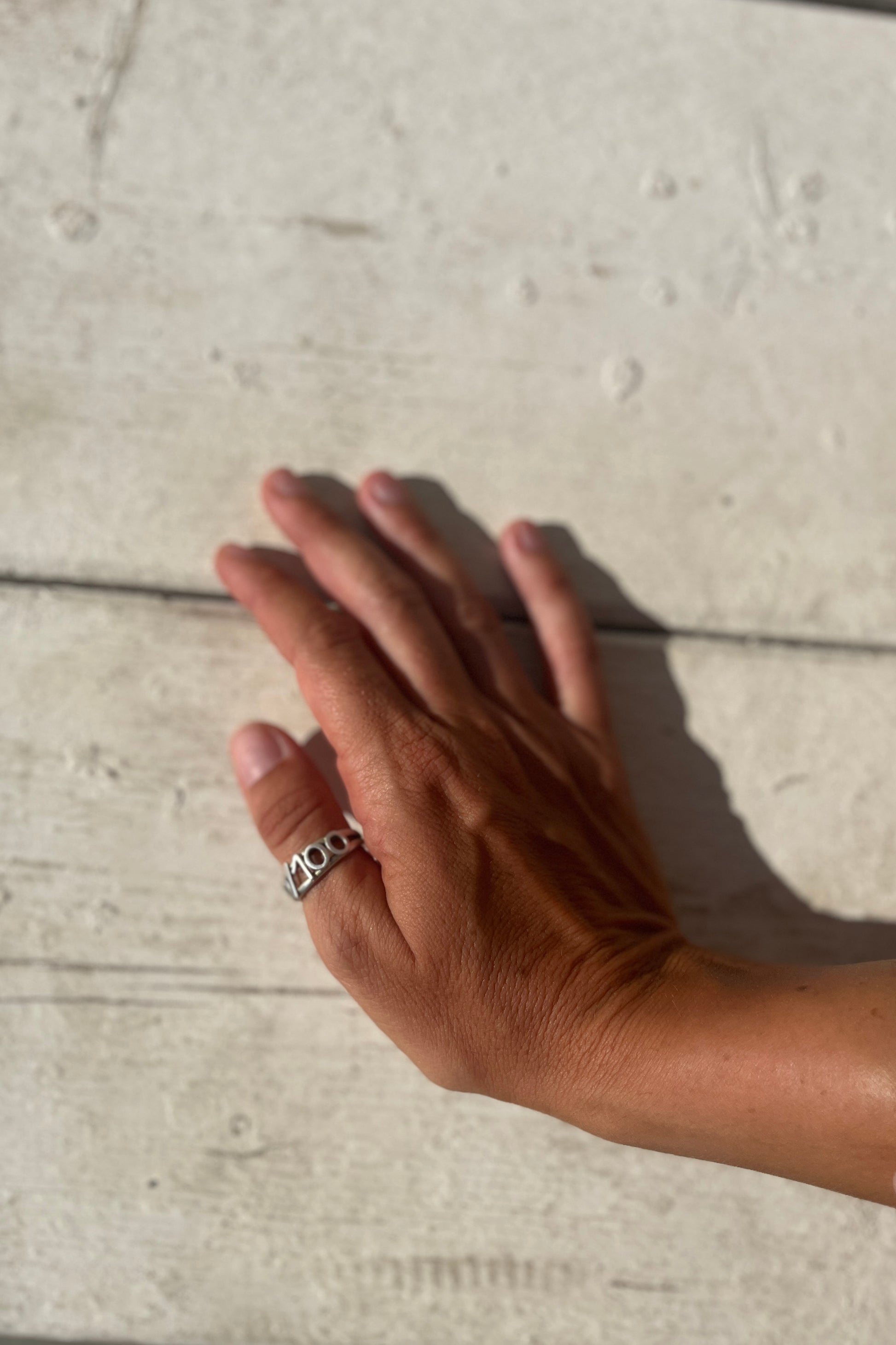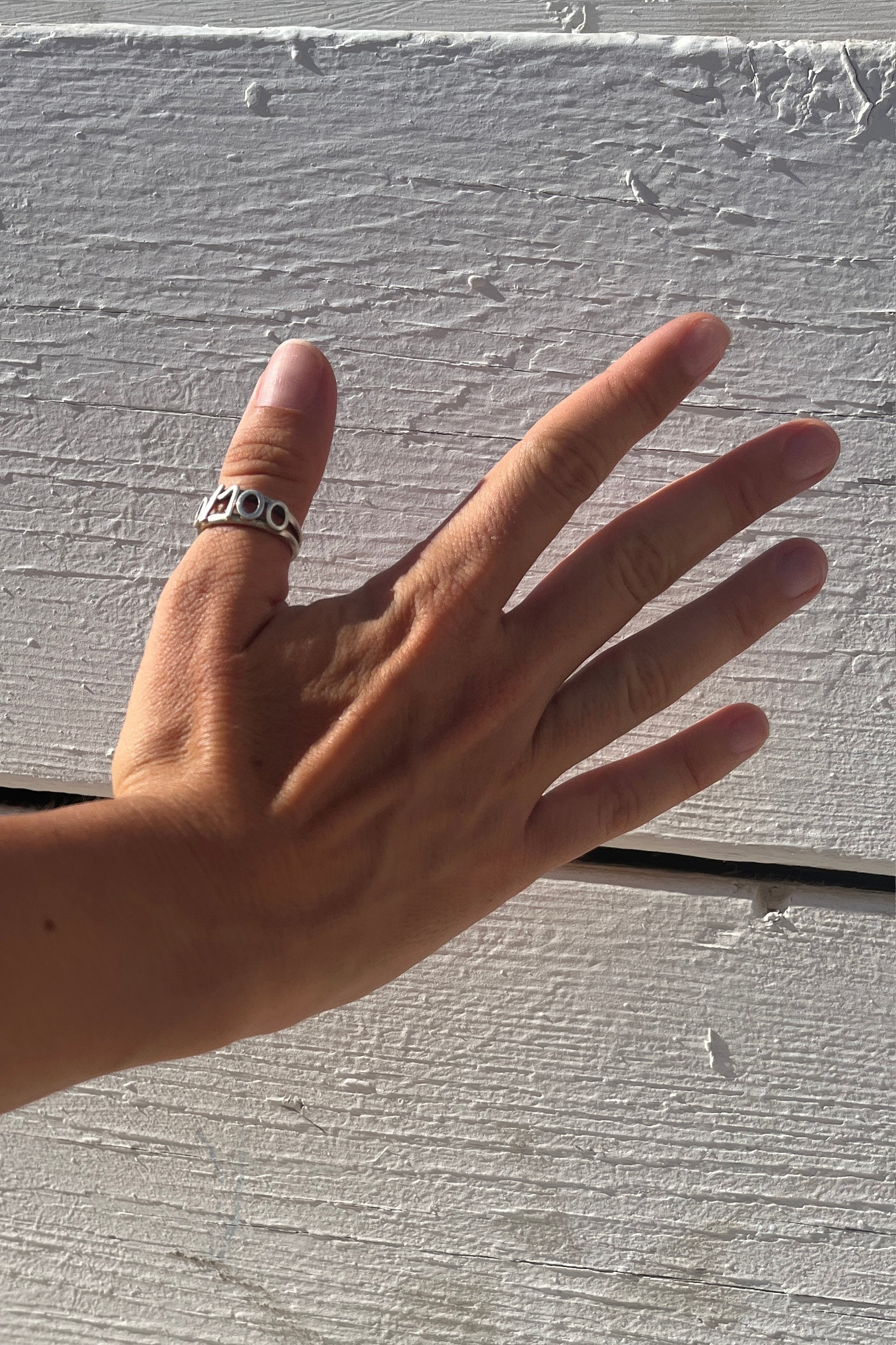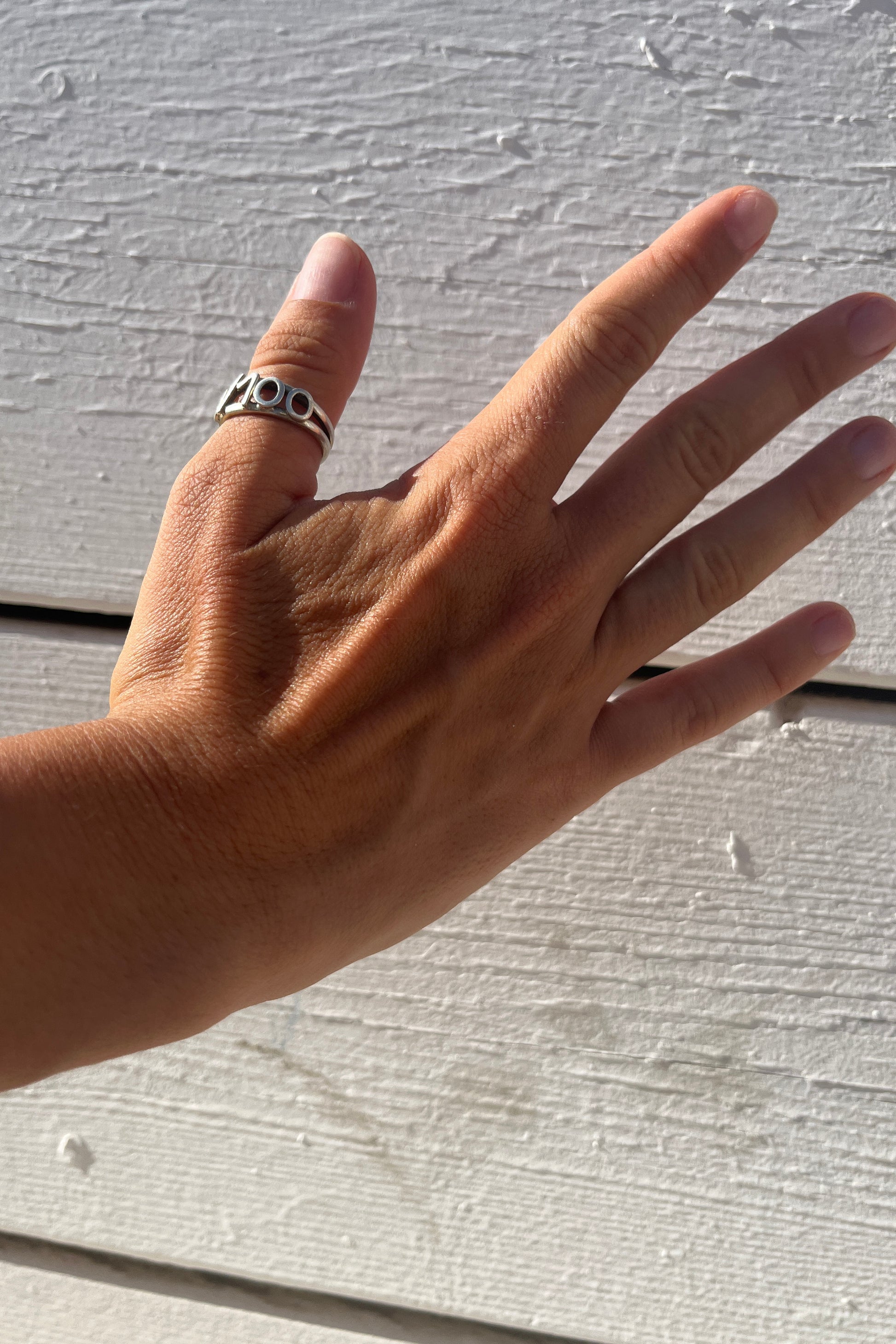 Two fine, interlocking silver bands combined to create an irresistibly bold ring with our logo on the front side.