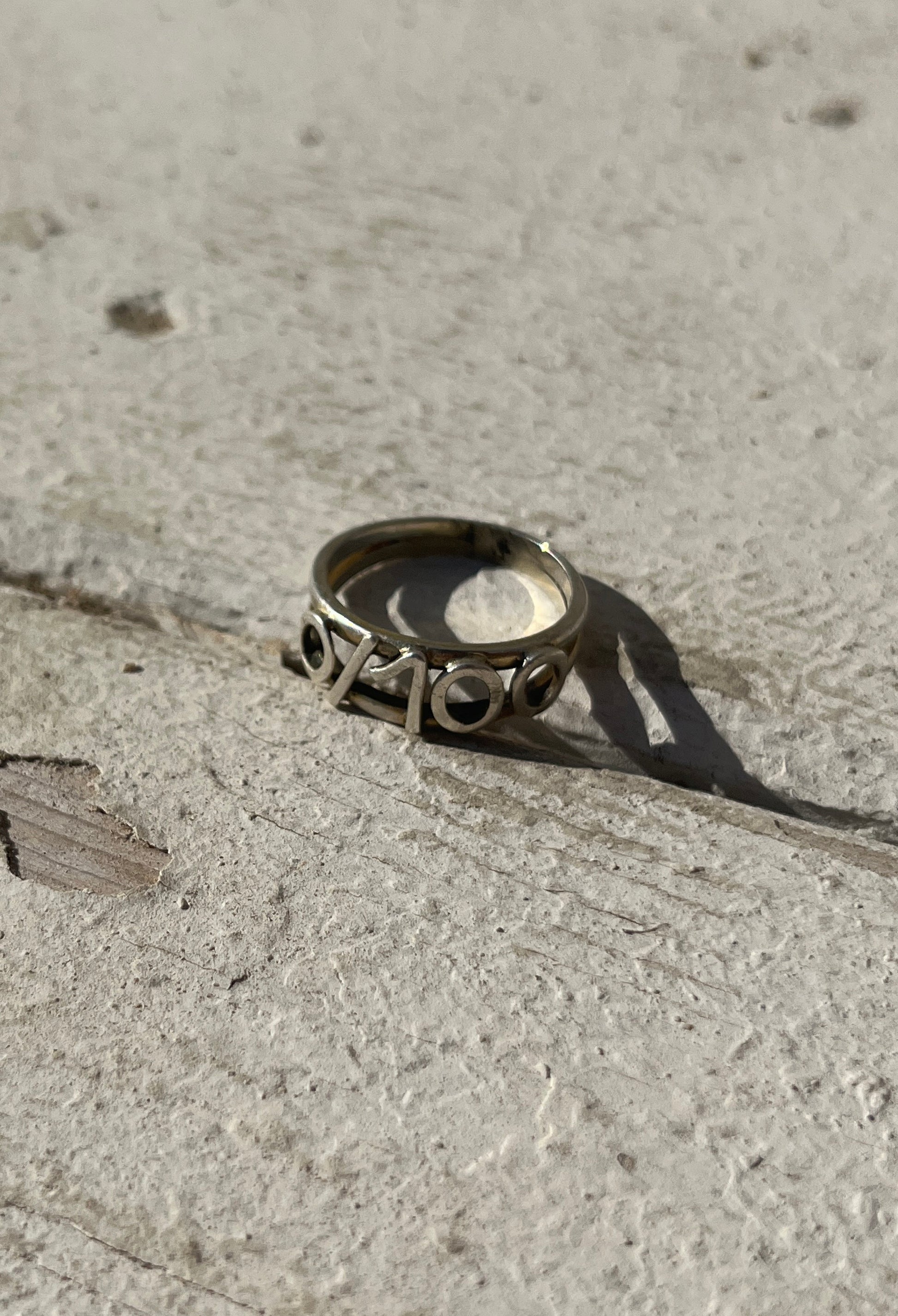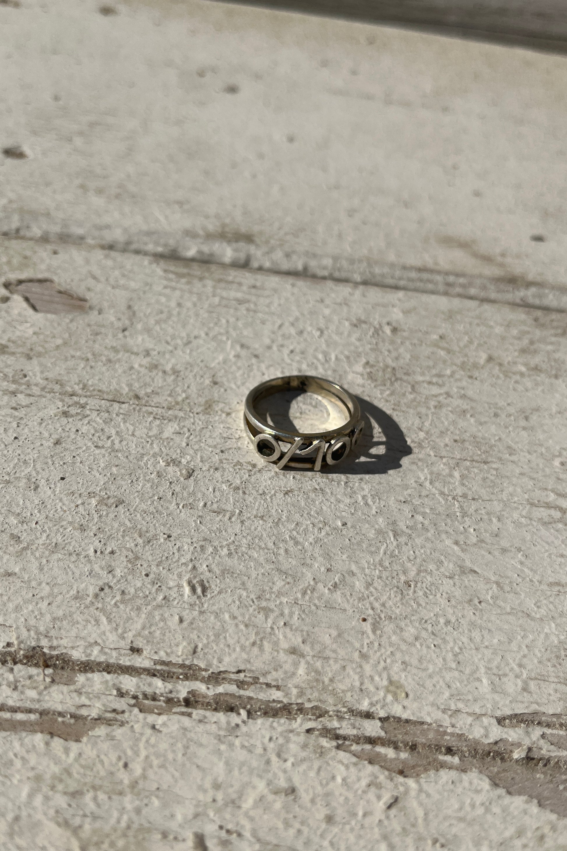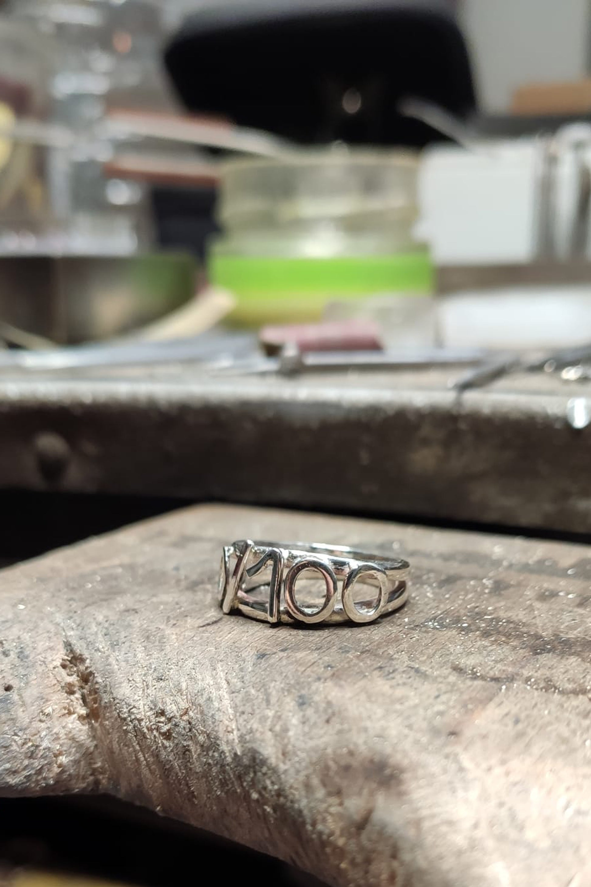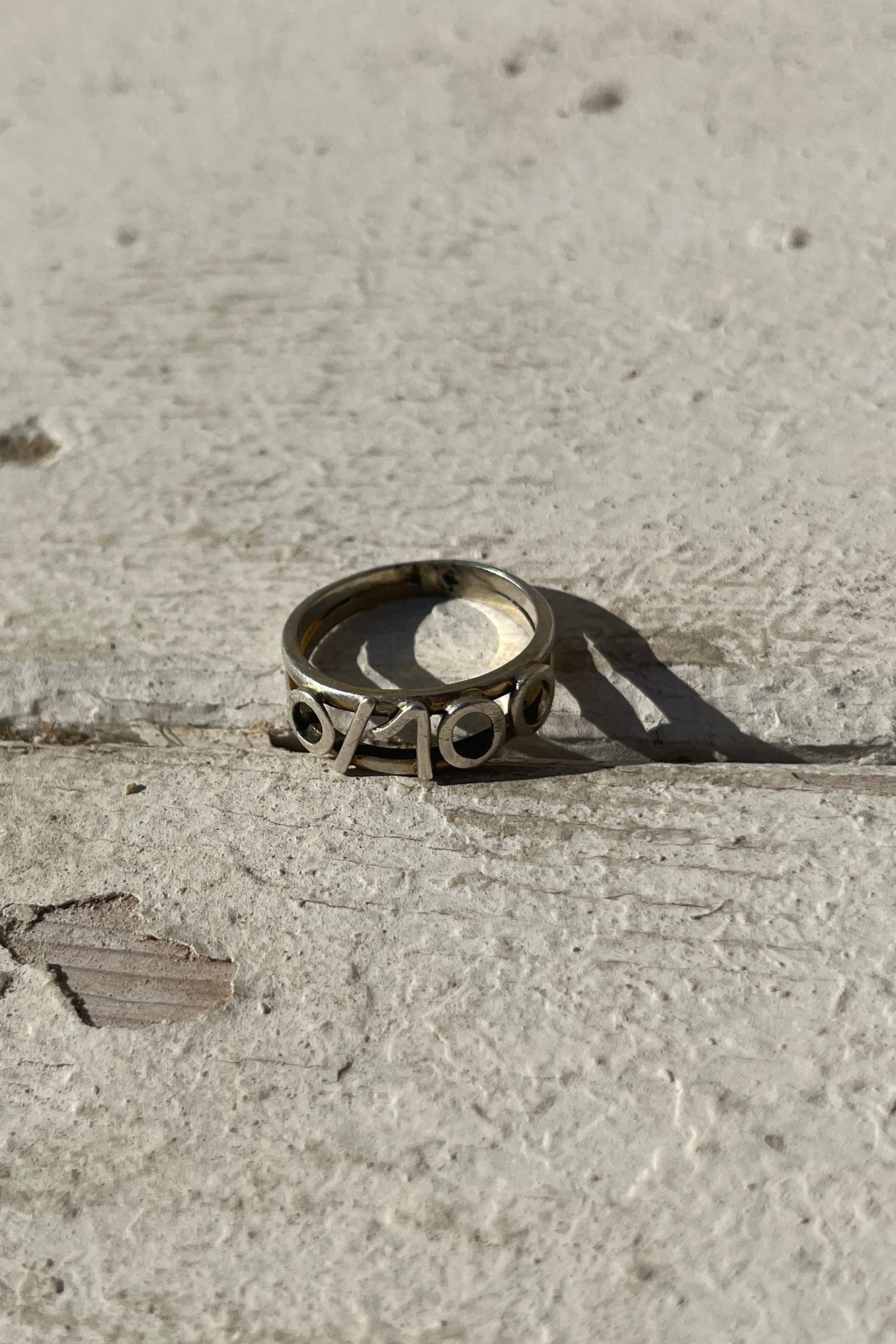 Two fine, interlocking silver bands combined to create an irresistibly bold ring with our logo on the front side.